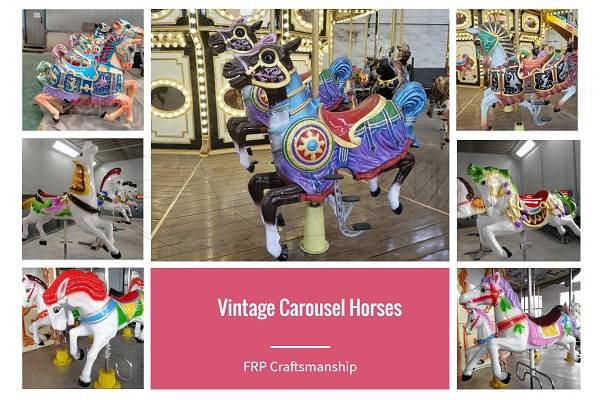 For vintage amusement carousel, the design of each horse features heritage style with hand-carved FRP craftsmanship and multiple complex and delicate production steps. The horses’ gestures, size, color, shape, etc, can be customized in our factory.