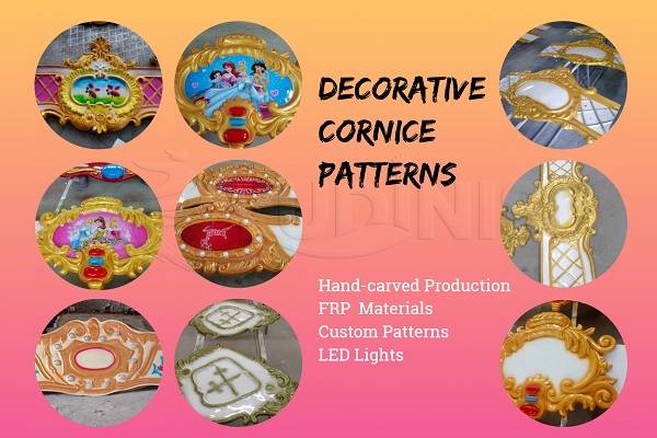 There are lots of exquisite hand-carved patterns on the carousel canopy eaves, such as the classic flower carvings, golden lines, painted patterns, etc. Also, we will add LED strips or decorative light bulbs on the cornice to enhance its visual effects. These patterns and lights can be customized, too.