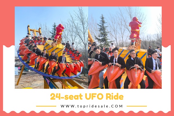 Og Dinis, it is called “shenzhou” flying UFO ride. The most hot-selling size is our 24-seat UFO ride for sale. In terms of capacity, it can effectively handle high passenger traffic, especially during holiday periods. And in terms of the appearance, yellow and orange are the eye-catching colors to help attract more passengers come. Að auki, we also support custom design to suit your needs, including the color, modeling, osfrv.